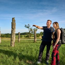 Behringen. Am 1. Oktober 2022 folgten viele Gäste der Einladung zur geführten Wanderung auf dem Skulpturenweg zwischen Behringen und dem Wildkatzendorf Hütscheroda. Initiator Jürgen Dawo erinnerte sich auf dem 10 km langen Skulpturenweg an Hintergründe und Anekdoten der vergangenen 23 Bildhauersymposien aus 25 Jahren mit vielen interessanten Details.