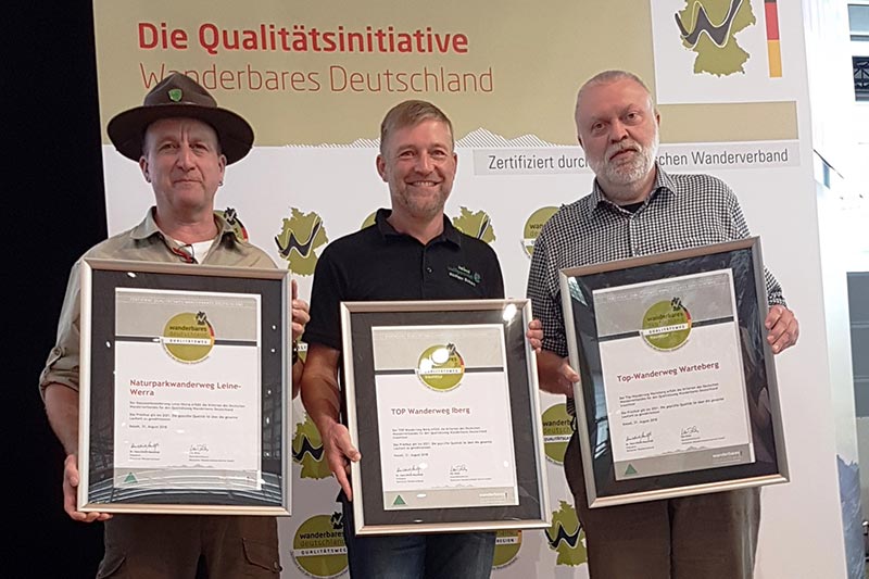Im Rahmen der Veranstaltung bekamen auch die frisch zertifizierten Qualitätswege Wanderbares Deutschland ihre Urkunden. Darunter waren in diesem Jahr gleich drei Eichsfelder Wanderwege: Der Naturparkweg Leine-Werra wurde zum dritten Mal prämiert und die Top-Wanderwege Erlebnis Iberg und Warteberg – Mittelpunkt Deutschland bekamen ihre erste Auszeichnung als Qualitätsweg Wanderbares Deutschland. Überreicht werden die Urkunden von Dr. Hans-Ulrich Rauchfuß, Präsidenten des Deutschen Wanderverbandes und Jochen Flasbarth, Staatssekretär im Bundesministerium für Umwelt, Naturschutz, Bau und nukleare Sicherheit.