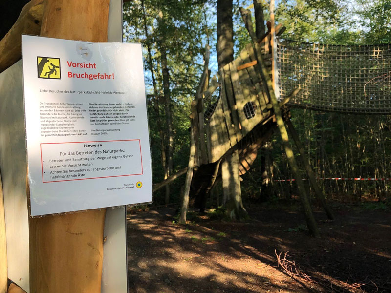 In Bereichen, in den Besucher jedoch länger verweilen, wie z.B. im Naturparkzentrum Fürstenhagen ist die Beseitigung von Gefährdungen notwendig. Aus diesem Grund ist der Bereich des Baumhauses für die Besucher zurzeit gesperrt. Die Naturparkverwaltung bitte alle Besucher um Verständnis. Das übrige Gelände des Naturparkzentrums ist jedoch weiterhin nutzbar.