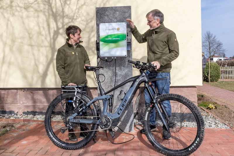 „Natürlich Auftanken“ lautet die Devise! Eine neue Ladesäule für E-Bikes steht ab sofort zur Verfügung. „Bereits bei der Planung haben wir uns mit den Eichsfeldwerken ausgetauscht, um an das in der Region bestehende und vom Landkreis Eichsfeld initiierten Ladenetz anzuschließen. So bietet die Station einen Bosch- und einen Shimanostecker sowie zwei Steckdosen zum Aufladen.“ berichtet Claudia Wilhelm, Leiterin des Naturparks. Die Förderung von alternativen Mobilitätsangeboten ist eine Aufgabe des Naturparks, so wurde die neue Ladestation durch das Thüringer Ministerium für Umwelt, Energie und Naturschutz finanziert. „Damit bieten wir Gästen ein zeitgemäßes Serviceangebot und laden dazu ein, den Naturpark per Fahrrad zu Entdecken.“ fügt Uwe Müller, zuständig für den Sachbereich Tourismus in der Naturparkverwaltung hinzu.