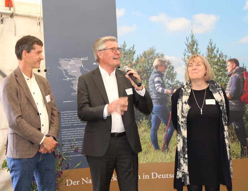 Fürstenhagen. Den Auftakt zum Naturparkfest bot die geführte Wanderung über die Dieteröder Klippen zum Naturparkzentrum. Arne Willenberg, Mitarbeiter für Biotop- und Artenschutz, informierte über das Beweidungsprojekt sowie zur Flora und Fauna am Wegesrand. Pünktlich zur feierlichen Eröffnung der neuen Ausstellung füllte sich das Festzelt. Friedel Heuwinkel (Präsident Verband Deutscher Naturparke), Dr. Burkhard Vogel (Staatssekretär Thüringer Ministerium für Umwelt, Energie und Naturschutz), Dr. Werner Henning (Landrat Eichsfeld), Ulrike Papenfuss (Atelier Papenfuss) sowie Claudia Wilhelm (Naturparkleiterin) führten in einer lockeren Moderationsrunde einen Exkurs zur Nachhaltigkeit.