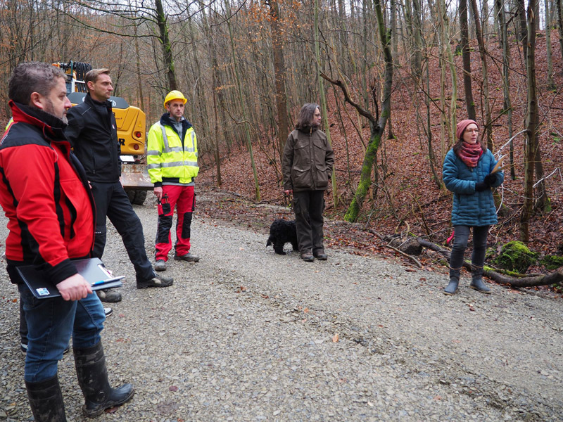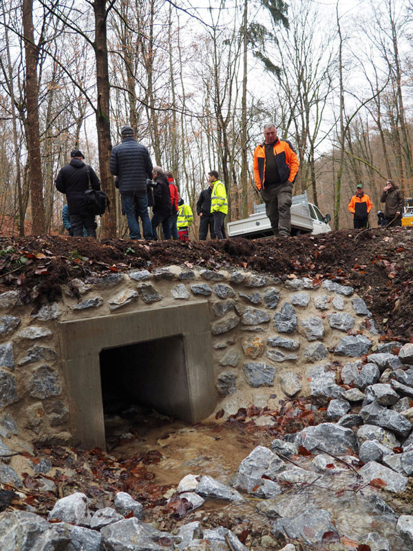 Im Rahmen des Naturschutzprojektes „Renaturierung von Kalktuffquellen und kalkreichen Niedermooren“ hat die Wildtierland Hainich gGmbH mit ihrer Natura 2000-Station Unstrut-Hainich/Eichsfeld erfolgreich diese Maßnahmen zur Renaturierung eines Abschnitts des Hollenbachs bei Mackenrode durchgeführt. Am 24.01.2022 wurde die Maßnahme final fertig gestellt und zusammen mit dem Kooperationspartner Naturpark Eichsfeld-Hainich-Werratal eine Infotafel zu dem Projekt und dem Lebensraum aufgestellt. Spitzenberg Bau Hoch- und Tiefbau GmbH führte letzte Arbeiten am Bauwerk durch und Martin Kellner vom Büro Beratende Ingenieure Kellner und Partner erläuterte das Vorhaben.