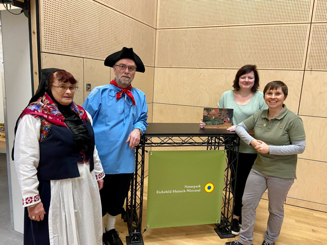Nach den einleitenden Worten startete Naturparkleiterin Claudia Wilhelm mit Ihrem Vortrag. Sie informierte über die Nationalen Naturlandschaften, die Unterschiede zwischen National- und Naturpark und führte die Gäste mit vielen Bildern durch die Landschaften Eichsfeld, Hainich und Werratal. Seit 1992 gibt es den Naturpark – die Stadt Treffurt samt Ortsteile liegen in der Gebietskulisse. Naturparke arbeiten in vier Handlungsfeldern: Naturschutz & Landschaftspflege, Erholung & Tourismus, Bildung und Regionalentwicklung. Ihr Hauptanliegen war jedoch die Gäste zu sensibilisieren, wie sie mit dem Kauf von saisonalen und regionalen Produkten die Kulturlandschaft des Naturparks fördern. „Sträucher wie Schlehe, Holunder oder Hagebutte prägen unsere Landschaft – ihre Früchte sind Zutaten für Liköre und Obstbrände, Streuobstwiesen sind Zeugen vergangener Tage – alte Obstsorten werden in regionalen Mostereien zu Saft verpresst, unter ihnen grasen Schafe und leisten damit einen wichtigen Beitrag zur Landschaftspflege. Mit unserem Konsumverhalten können wir daher einen wichtigen Beitrag leisten, um unsere Kulturlandschaft zu erhalten“ so Claudia Wilhelm.