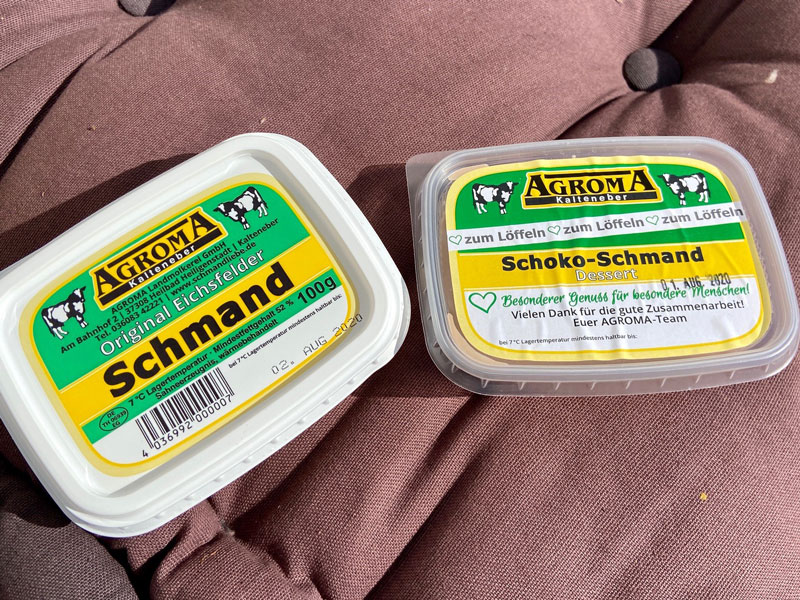 Neu und noch nicht im Verkauf ist der Schokoschmand. Dieses „Hüftgold“ mit Zartbitter löffelt man direkt aus dem Becher oder als Aufstrich auf dem morgendlichen Brötchen.