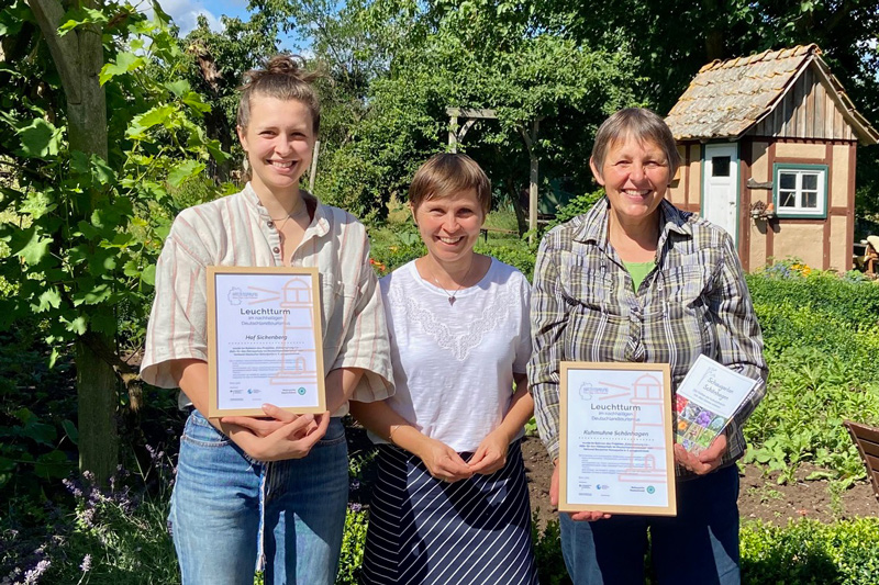 „Heute freue ich mich, dass ich diese persönlich an Karin Weng für den Schaugarten Schönhagen und Annika Löschau sowie Tizian Molnár für den Hof Sickenberg übergeben darf. Als Leuchttürme stehen sie stellvertretend für das wachsende Angebot an nachhaltigen Tourismuserlebnissen in Deutschland“ so Claudia Wilhelm, die die Auszeichnung stellvertretend für den Dachverband übergab.