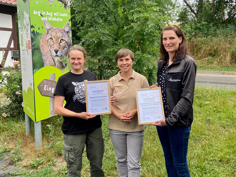 Begleitend zum Partnerprogramm gab Naturparkleiterin Claudia Wilhelm den Aufruf für Leuchttürme im Deutschlandtourismus in die Runde der touristischen Akteure. Sechs Betriebe/Vereine reichten ihre Unterlagen beim Dachverband der Naturparke (VDN e.V.) ein. Vier davon wurden ausgewählt.„Heute freue ich mich, dass ich diese persönlich an Frau Dr. Vogel für das Wildkatzendorf Hütscheroda und Herrn Zilling für den Baumkronenpfad übergeben darf. Als Leuchttürme stehen sie stellvertretend für das wachsende Angebot an nachhaltigen Tourismuserlebnissen in Deutschland“ so Claudia Wilhelm, die die Auszeichnung stellvertretend für den Dachverband übergab.