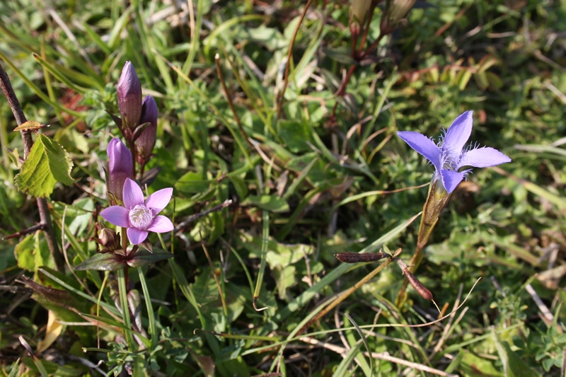 Noch im Oktober blühen in Magerrasen und Trockenwiesen zwei Enzianarten, der Deutsche Kranzenzian Gentianella germanica (links im Bild) und der Gewöhnliche Fransenenzian Gentianopsis ciliata (rechts im Bild). Beide unterscheiden sich sowohl in der Blütenfarbe als auch in der Anzahl der Blütenblätter. Vier gefranste Blütenblätter kennzeichnen den Fransenenzian, während fünf, einen Wimpernkranz umschließende Blütenblätter, ein Merkmal des Deutschen Kranzenzians ist.
